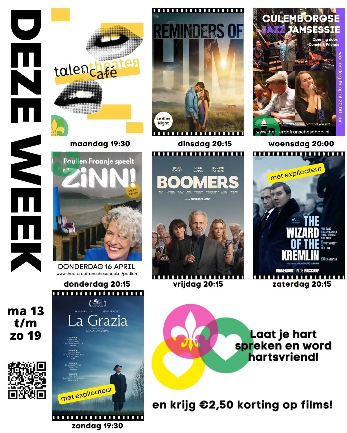 #theater #film #lekkerdichtbij #talencafé #remindersoflhim #culemborgse jazzjamsessie #zinn #boomers #thewizardofthekremlin #lagrazia